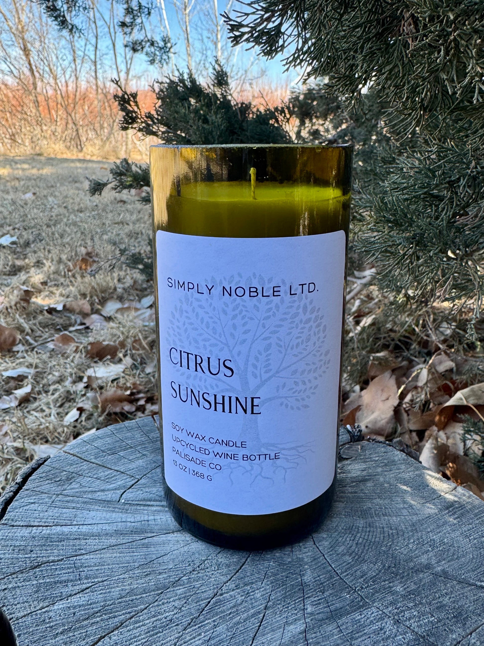 Contains 13 oz. soy wax in an upcycled wine bottle. Burn time: approx. 45 hrs. Remove dust cover before lighting.
