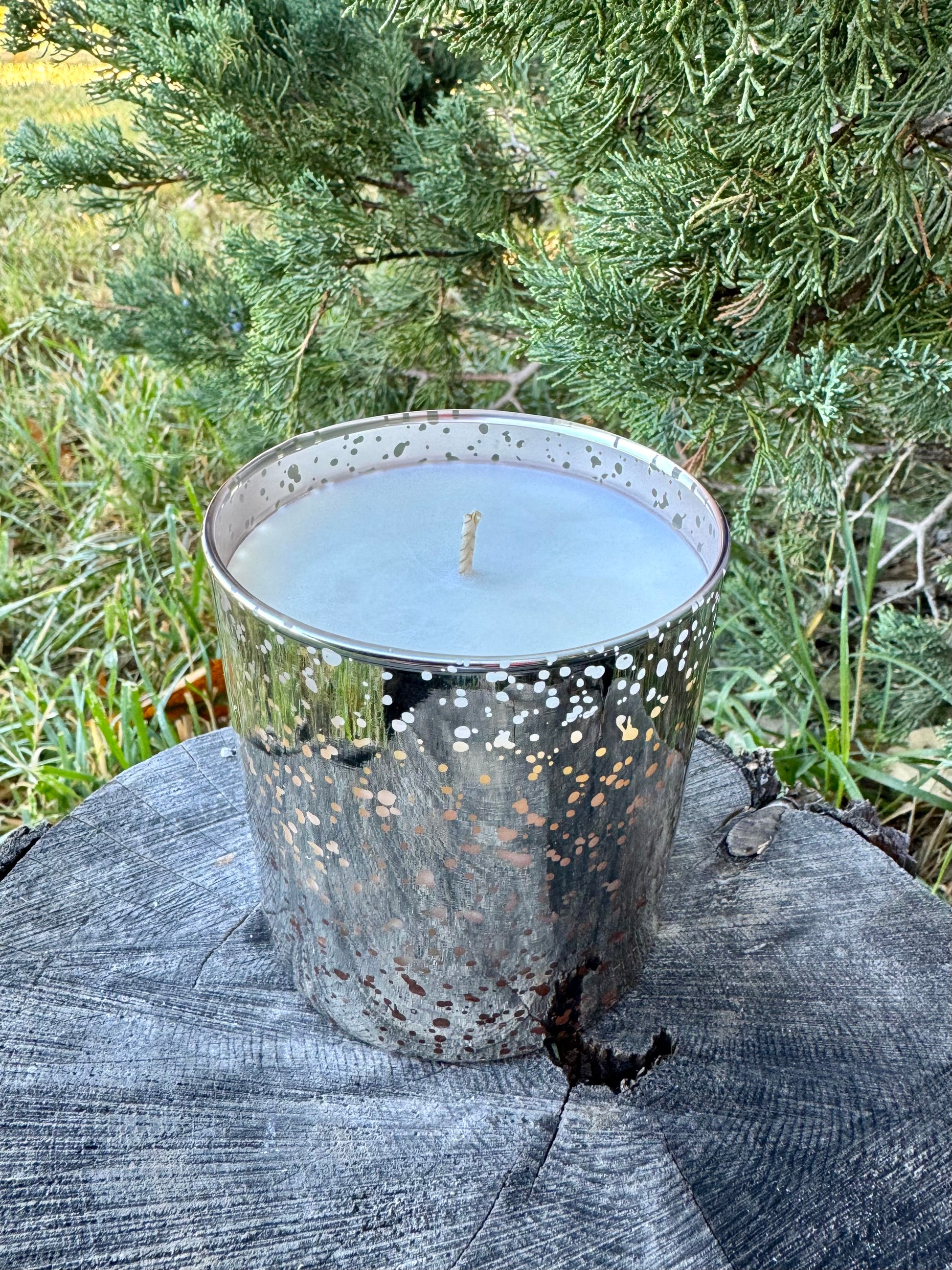 Contains 9 oz. soy wax in an elegant silver mercury jar that shimmers when lit. Burn time: approx. 33 hrs.