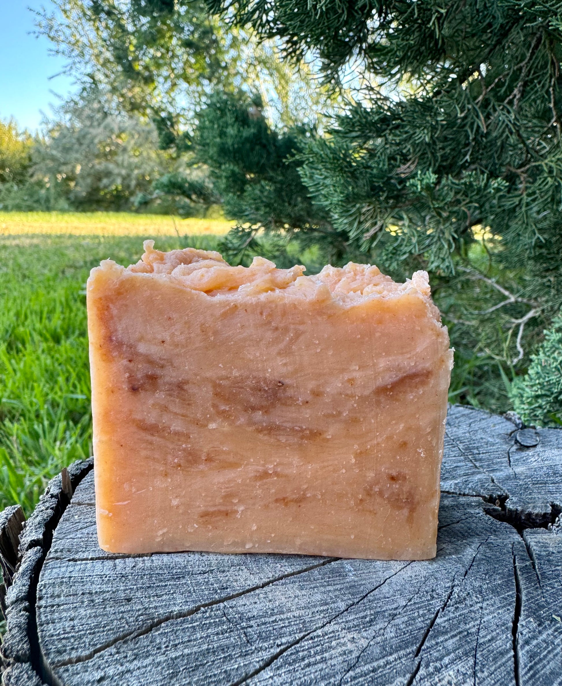 Ingredients: Lard, tomato puree, olive oil, coconut milk, distilled water, coconut oil, lye, shea butter, castor oil, sweet almond oil, carrot powder, kaolin clay, and fragrance oil.