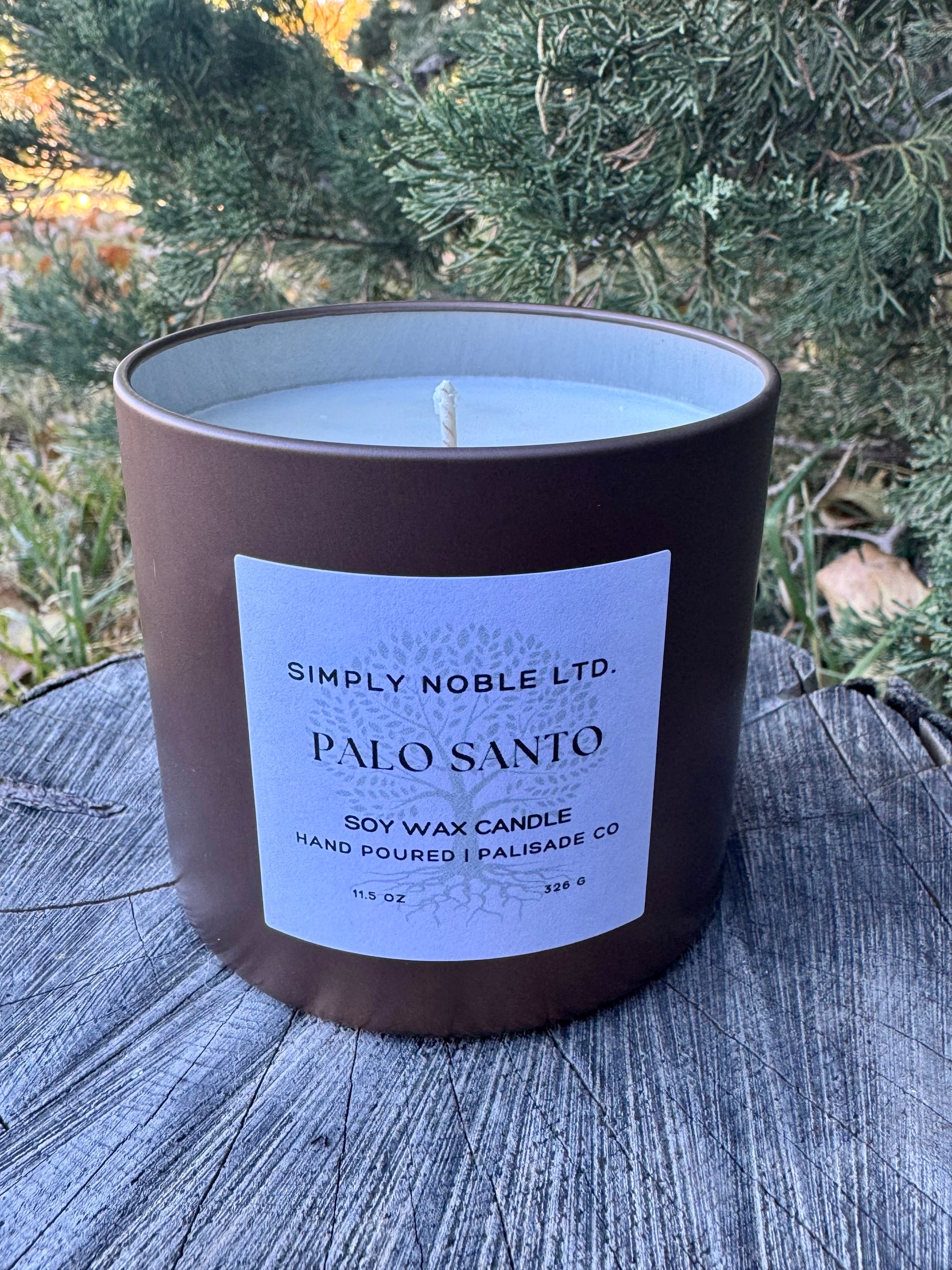 Contains 11.5 soy wax. Hand poured in a styled bronze tin. Includes lid. Burn time: approx. 43 hrs. Always burn within sight and away from flammables. Keep out of reach of children and pets.
